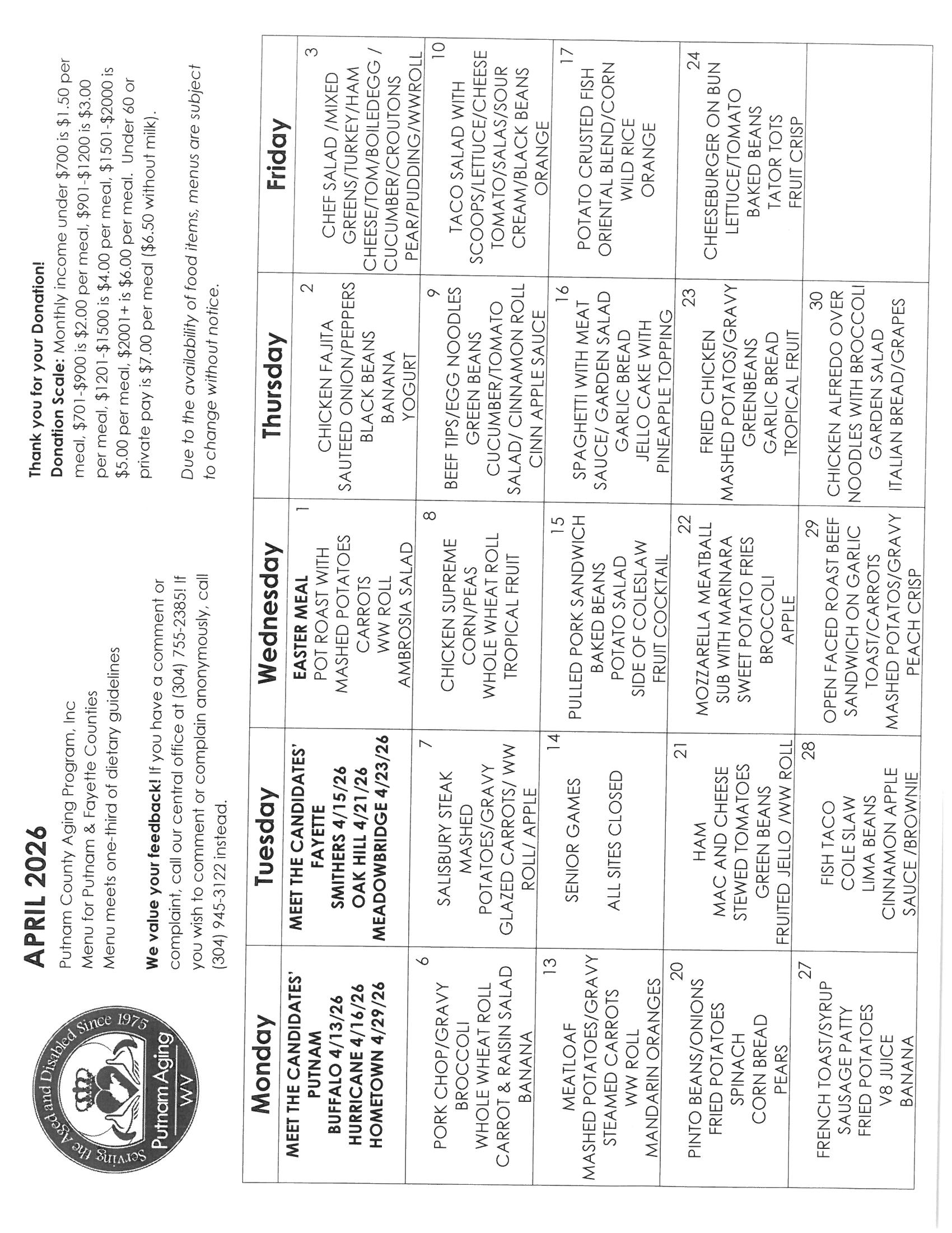 Menus for Fayette and Putnam counties are the same unless otherwise noted.